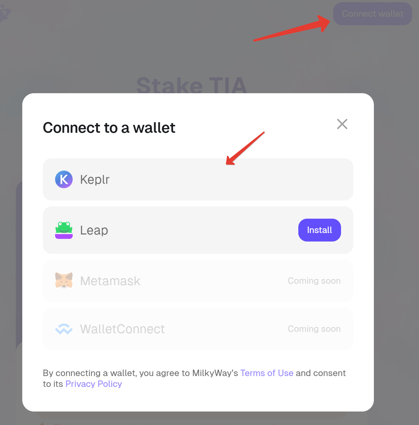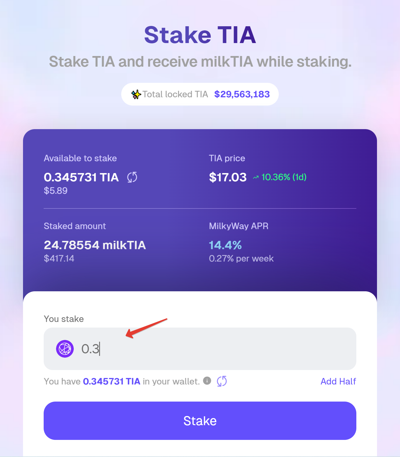 После стейкинга вам на кошелек автоматом прилетят токены milkTIA.