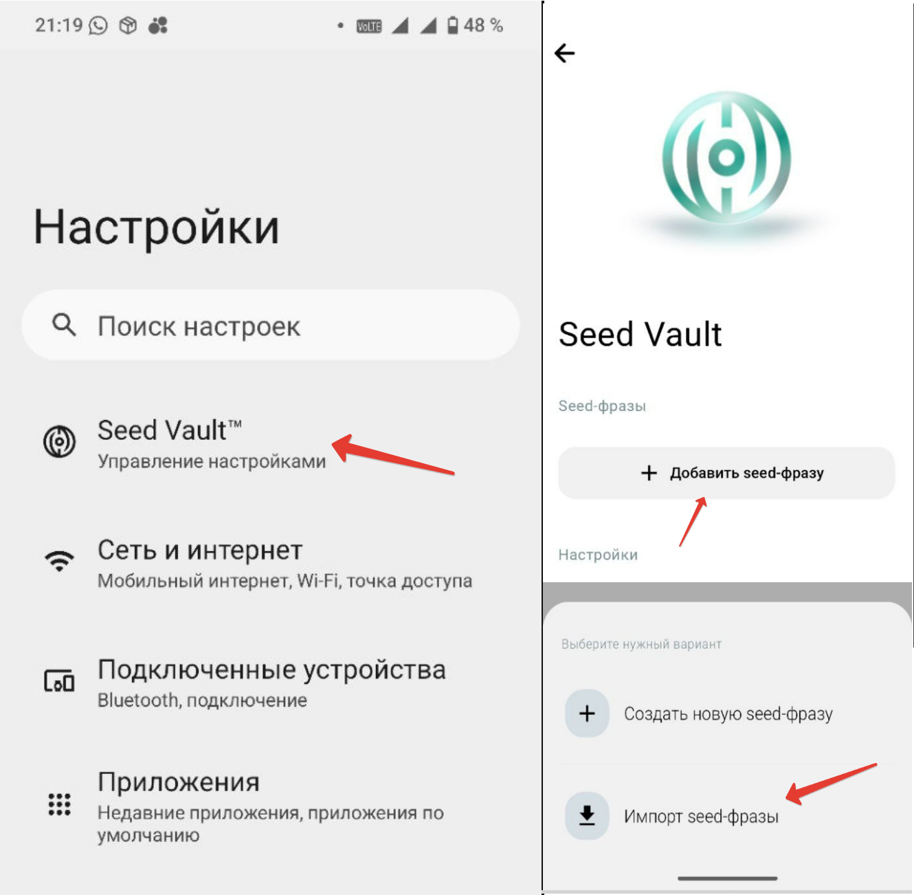 - Импортировать ваш существующий кошелёк. Ему присваивается имя .skr, и вся его активность с любых устройств должна учитываться системой. Это удобно, не нужно плодить кошельки. Импортировать кошелек вы можете в любое время в Настройки — Seed Vault. Но вот домен .skr вы можете привязать только к одной сидке (и именно она будет учитываться в onchain активности).