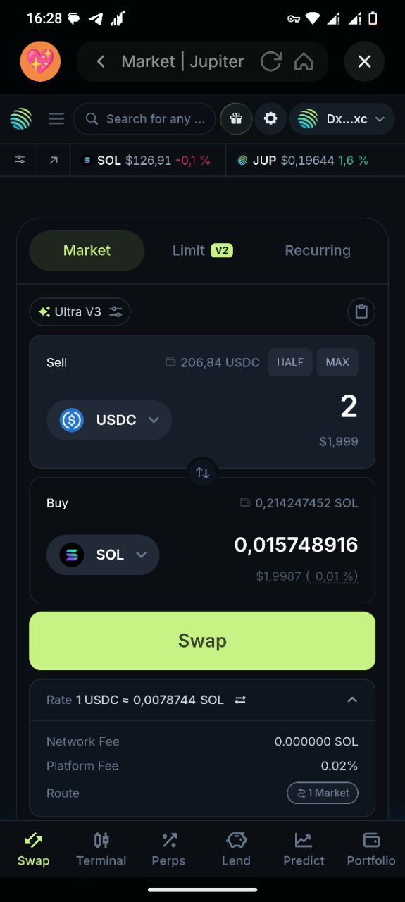 - Стратегия: ежедневные свапы 0.001-0.002 SOL через Jupiter (в приложении — «Trade» либо web-версии «Swap»). В первом сезоне пишут, что нужно было 50+ транзакций в день для 5 уровня. Наверное в этом сезоне нужно будет столько же или больше. Добавляйте стейкинг SOL, минт NFT и прочие транзы.